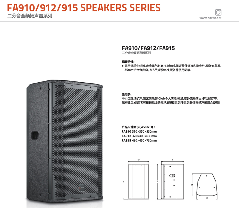 FA系列是由单10寸/单12寸/单15寸/双15寸共四个型号规格组成,是一款专为室内外流动演出而设计的二分音全频扬声器系统.低音单元音盆是进口纤维及纸浆制作.高音采用进口钛膜音圈.箱体采用18mm优质中纤板制作,板材采用榫卯结构式拼接,梯形结构设计.很大限度地抑制了箱内驻波的产生。蜂窝式铁网内贴有防尘透声海绵,表面喷涂耐磨黑色涂料,保证更佳的硬度和稳定性,款式新颖。