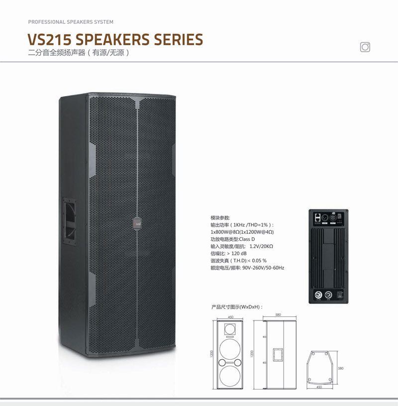 NVS215是双15寸设计,是一款能应用于各种扩声场所的二分音全频扬声器系统.箱体采用优质中纤板制作,板材榫卯结构拼接,确保箱体牢固可靠,梯形结构,正面呈圆弧形设计,较大限度地抑制了箱内驻波的产生,表面喷涂耐磨黑色涂料,保证硬度和稳定性。采用大功率的低音单元和高音单元,功率强劲,声压级大。