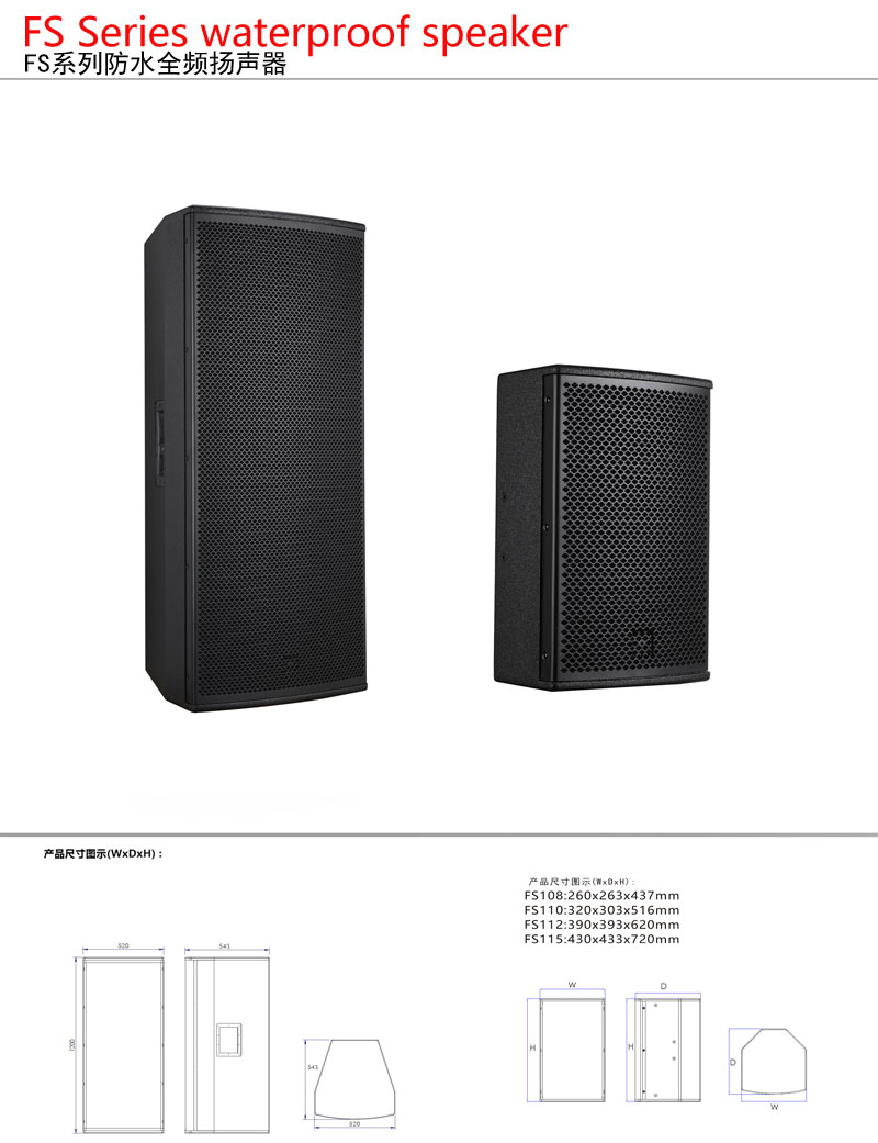 FS防水系列多功能扬声器是针对各种耐用性要求和便携性要求较高的场所设计,箱体采用防水级桦木层压板制作而成,外表喷涂超厚聚脲涂层,全气候防水面网,既具有良好的耐磨防水性能,又具有出色的音质表现。