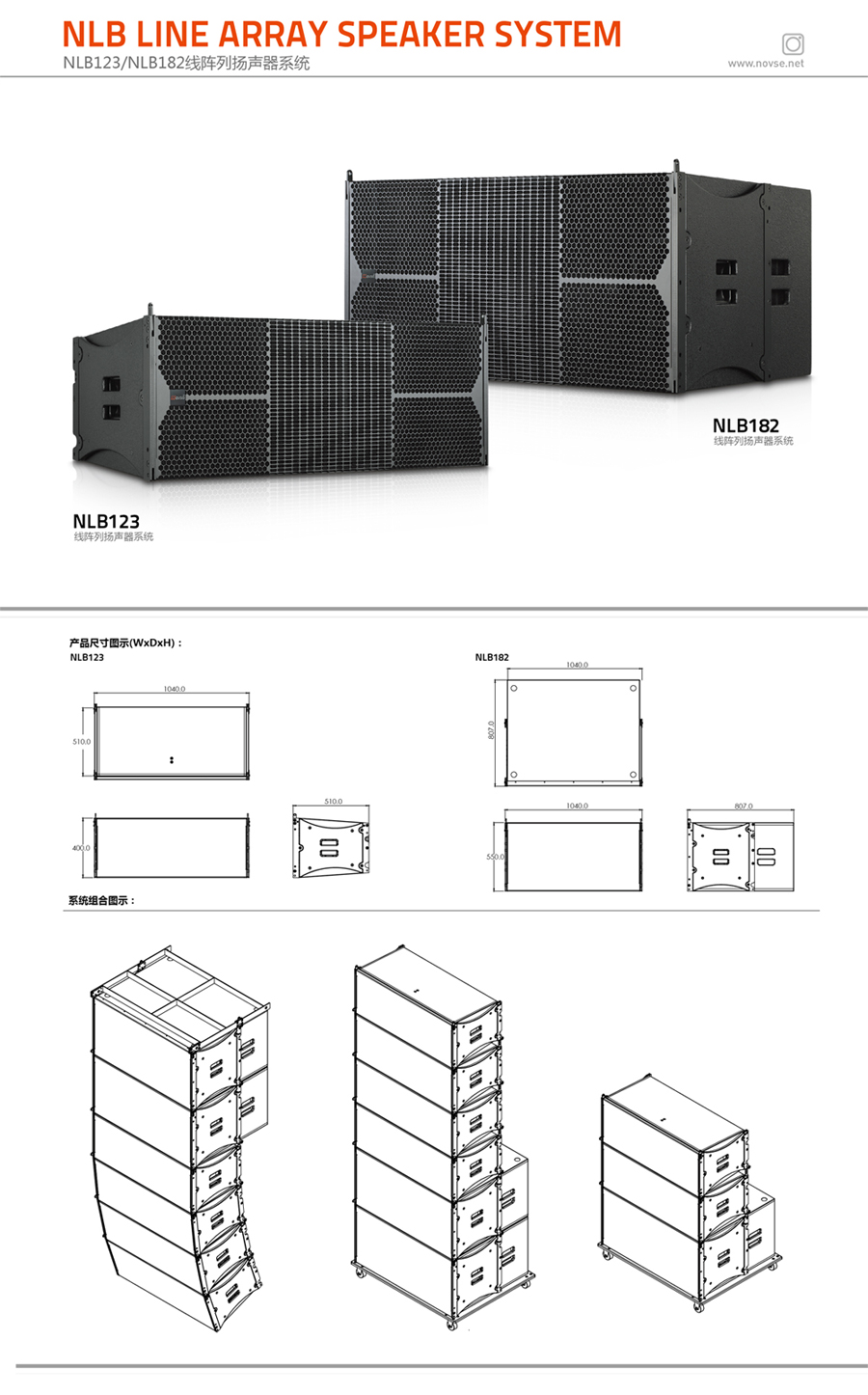 NLB-123是方元音响自主研发的第三代大中型演出三分频线阵列扬声器系统,内置2只12寸大功率低音单元、2只高灵敏度的6.5寸中音单元、2只1.75寸高频压缩驱动器, 驱动器通过两个独立的平面波转化器,前端配合一个恒指向号角而产生平行波。