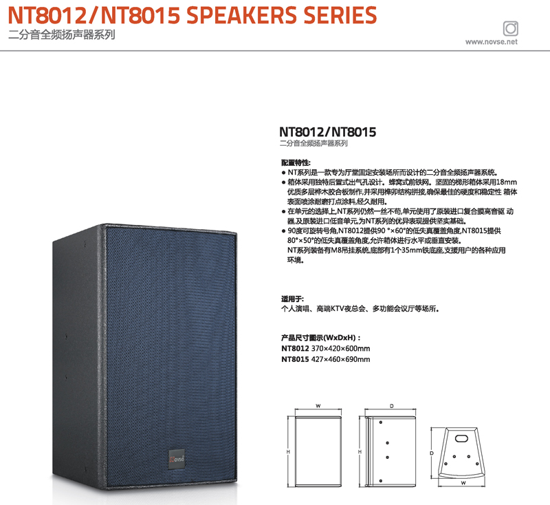 在单元的选择上,NT系列仍然一丝不苟,单元使用了原装进口复合膜高音驱动器及原装进口低音单元,为NT系列的优异表现提供坚实基础。90度可旋转号角,NT8012提供90°×60°的低失真覆盖角度,NT8015提供80°×50°的低失真覆盖角度,允许箱体进行水平或垂直安装。