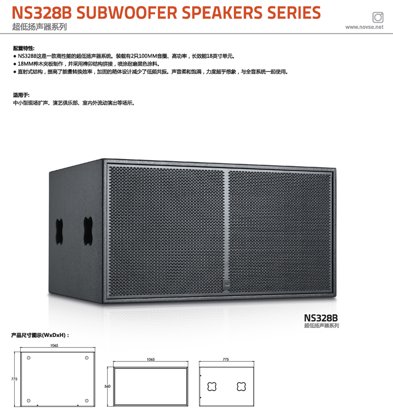NS328B是一款高性能的双18寸超低扬声器系统。装载有2只经久耐用的100mm音圈长效能单元,箱体由优质18mm多层桦木夹板制作,并采用榫卯结构拼接,喷涂耐磨黑色涂料,支援各种使用环境。